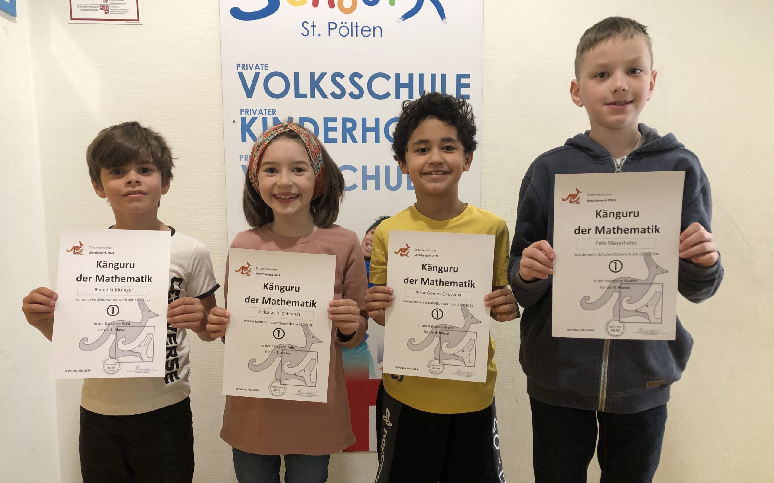 Die Klassensieger*innen beim Känguru-Wettbewerb sind heuer Benedikt, Felizitas, Artur und Felix. Congratulations!